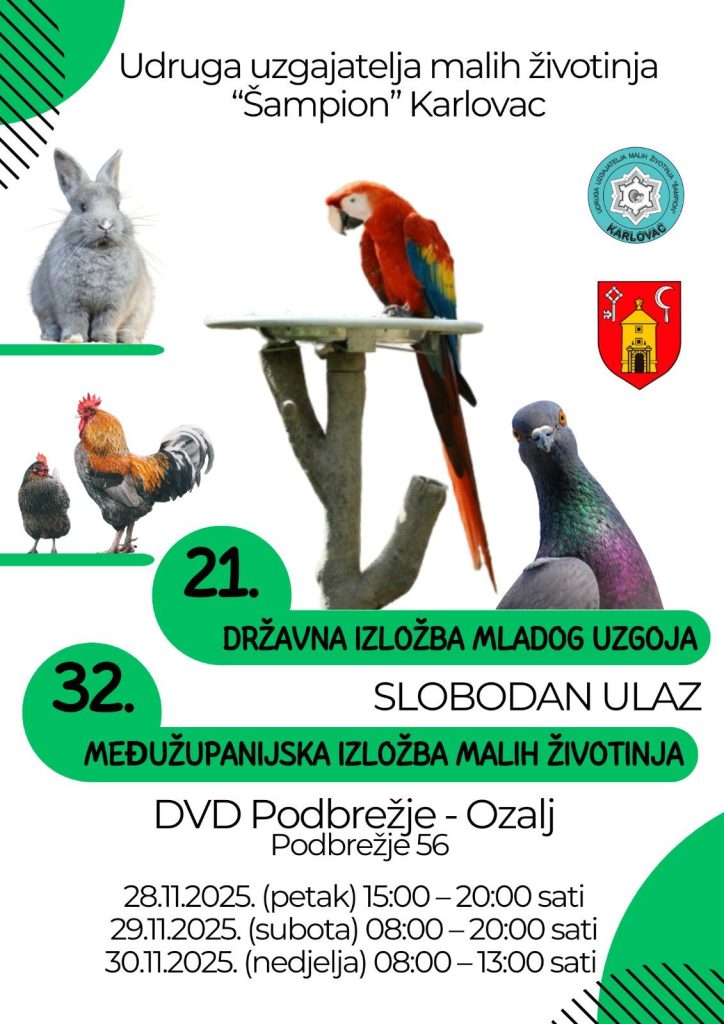Udruga uzgajatelja malih životinja „Šampion“ Karlovac i ove godine organizira Međužupanijsku izložbu malih životinja te Državnu izložbu mladog uzgoja koje će se održati u Domu Podbrežje, a počinju danas u 15 h i traju do nedjelje do 13 h.